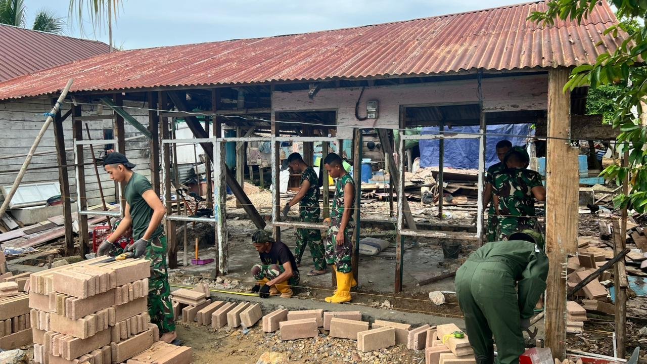 Prajurit TNI dengan penuh ketelitian membangun kembali rumah warga yang sebelumnya hampir roboh. Setiap tahapan pembangunan dikerjakan dengan standar konstruksi yang baik guna memastikan hunian lebih aman dan sehat untuk ditempati.