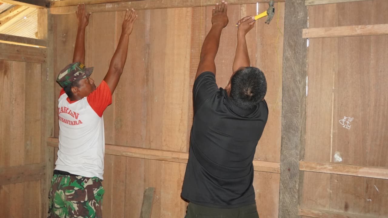 Pekerjaan fisik terus berjalan dengan intensitas tinggi. Anggota Satgas bersama masyarakat setempat bahu-membahu menyelesaikan bagian demi bagian bangunan, mulai dari struktur atap hingga penyempurnaan dinding rumah.