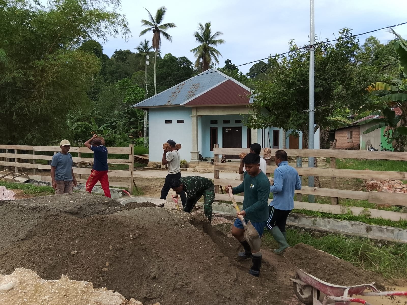 Personel TNI bersama warga bekerja secara bergantian mengangkut material pembangunan guna mempercepat penyelesaian infrastruktur yang menjadi kebutuhan utama masyarakat setempat.