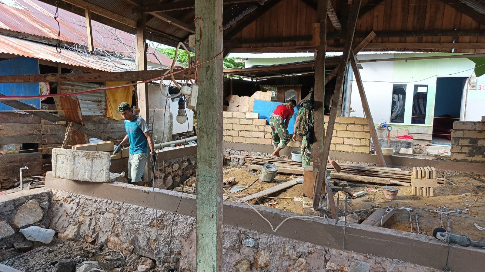 Personel dari Kodim 1417/Kendari tampak bekerja berdampingan dengan warga, termasuk pemilik rumah, Ibu Ninda.