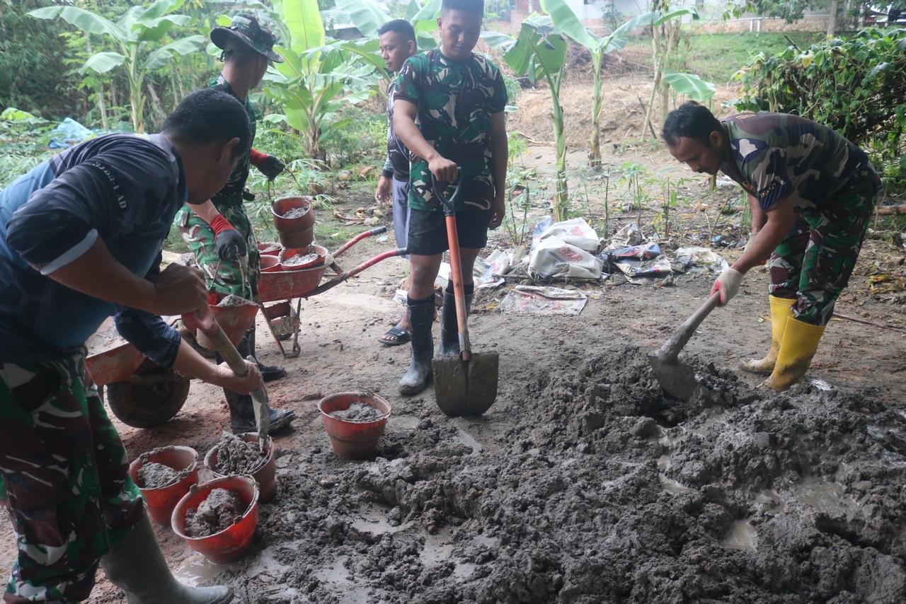Tak hanya prajurit TNI, masyarakat setempat juga turut ambil bagian dalam proses pembangunan talud. Mereka bersama-sama mengangkat material, menyusun batu, hingga membantu proses pengadukan semen.