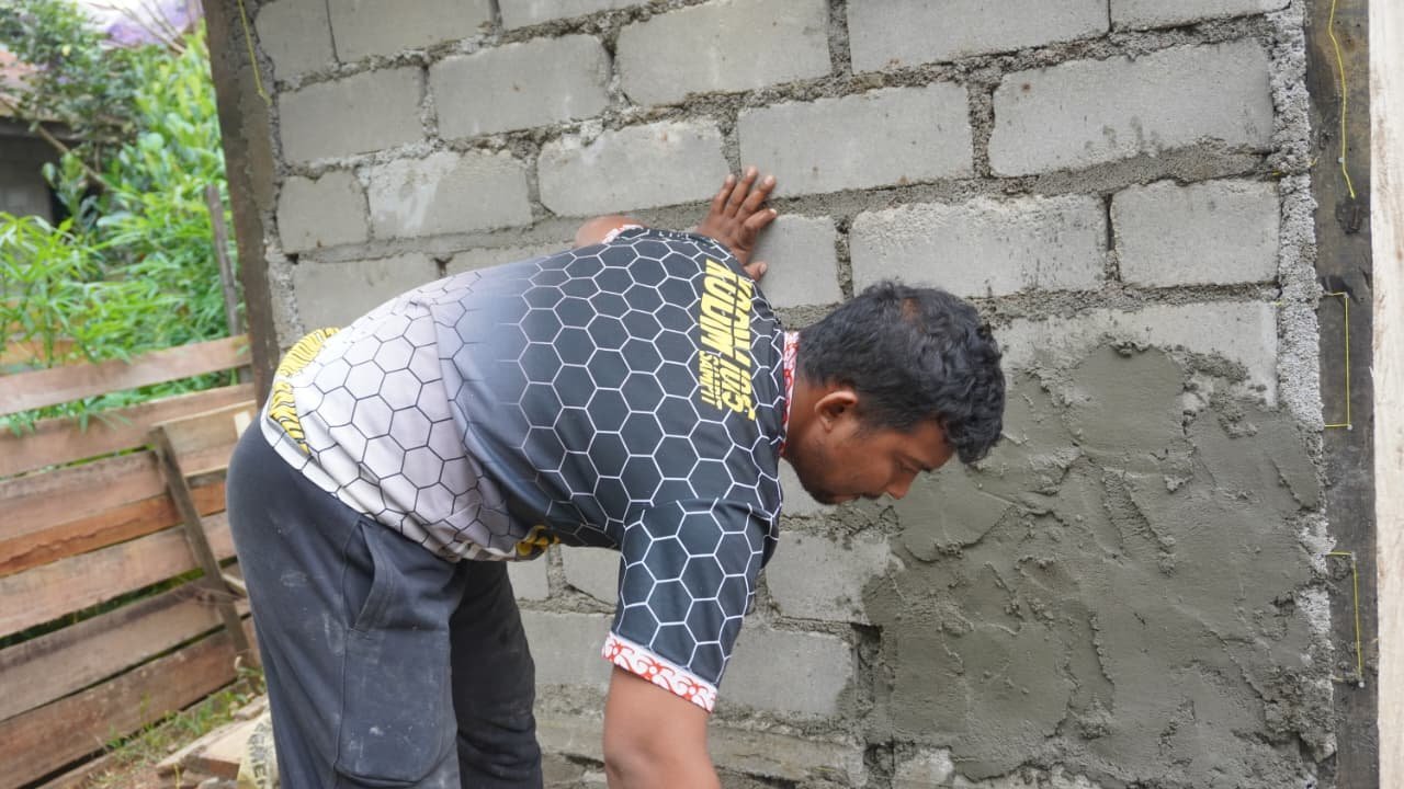 Sejak pagi hari, prajurit TNI dan masyarakat tampak bahu-membahu mengaduk semen serta meratakan plester pada dinding bangunan. Tahapan ini menjadi bagian penting dalam proses penyempurnaan konstruksi sebelum memasuki tahap finishing.