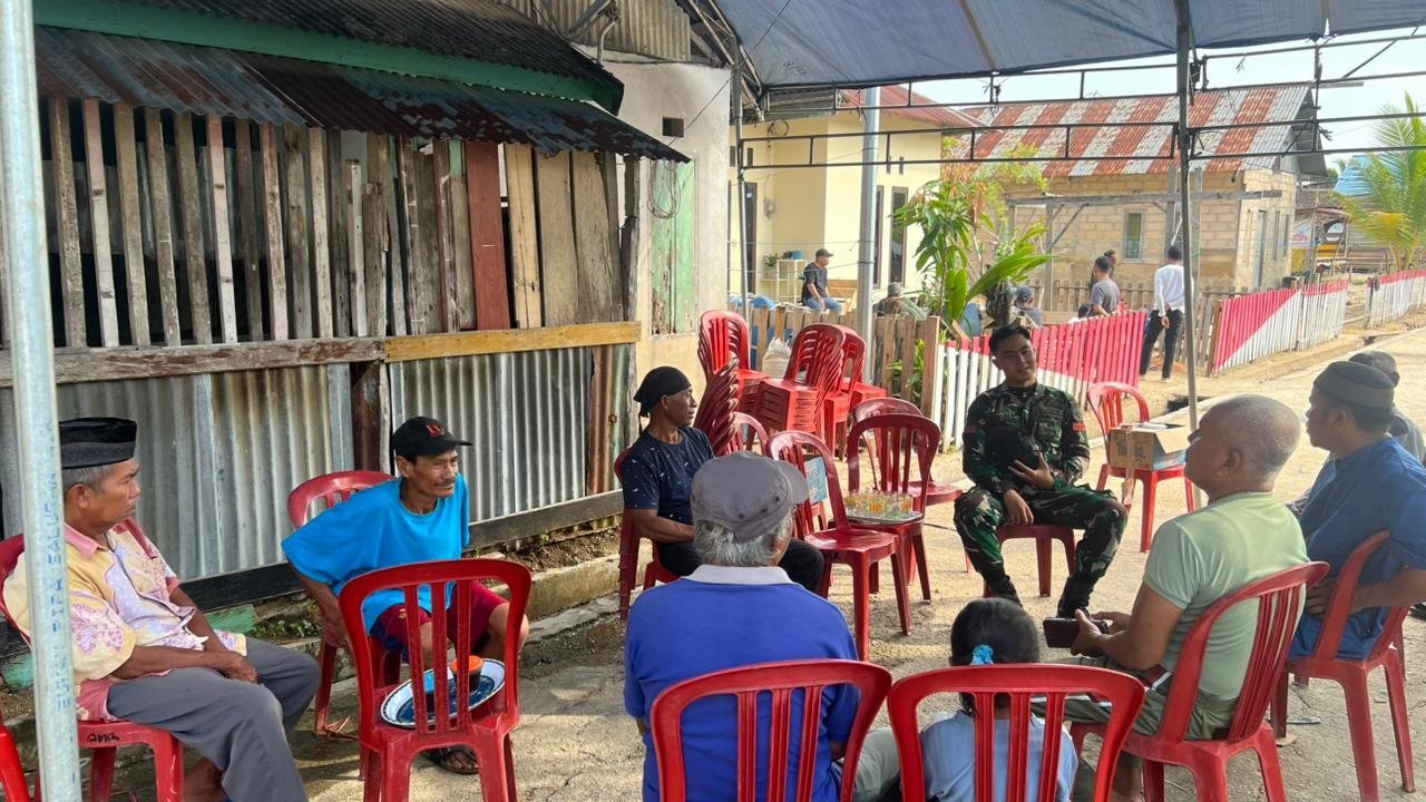 Suasana akrab terlihat saat prajurit berbincang santai dengan warga di sela aktivitas mereka. Interaksi tersebut menciptakan rasa kedekatan yang mampu memperkuat solidaritas antara aparat dan masyarakat.