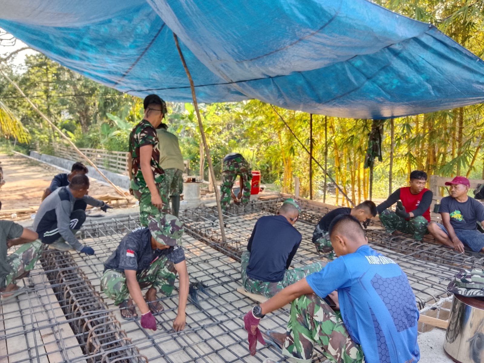 Pada tahap ini, prajurit TNI bersama warga setempat memusatkan perhatian pada perakitan besi tulangan yang menjadi fondasi utama kekuatan badan jembatan. Di bawah tenda darurat, mereka tampak teliti mengikat dan menyusun rangka besi sesuai ukuran dan spesifikasi teknis konstruksi.