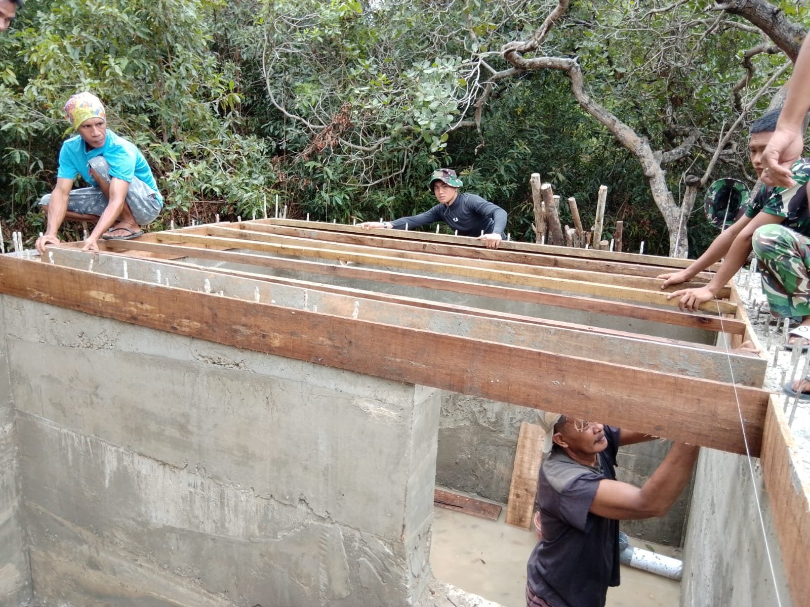 Dengan penuh ketelitian, prajurit dan warga menyusun rangka kayu di atas struktur beton sebagai persiapan pengecoran. Tahapan ini menjadi bagian penting untuk memastikan penutup bak kuat dan presisi.