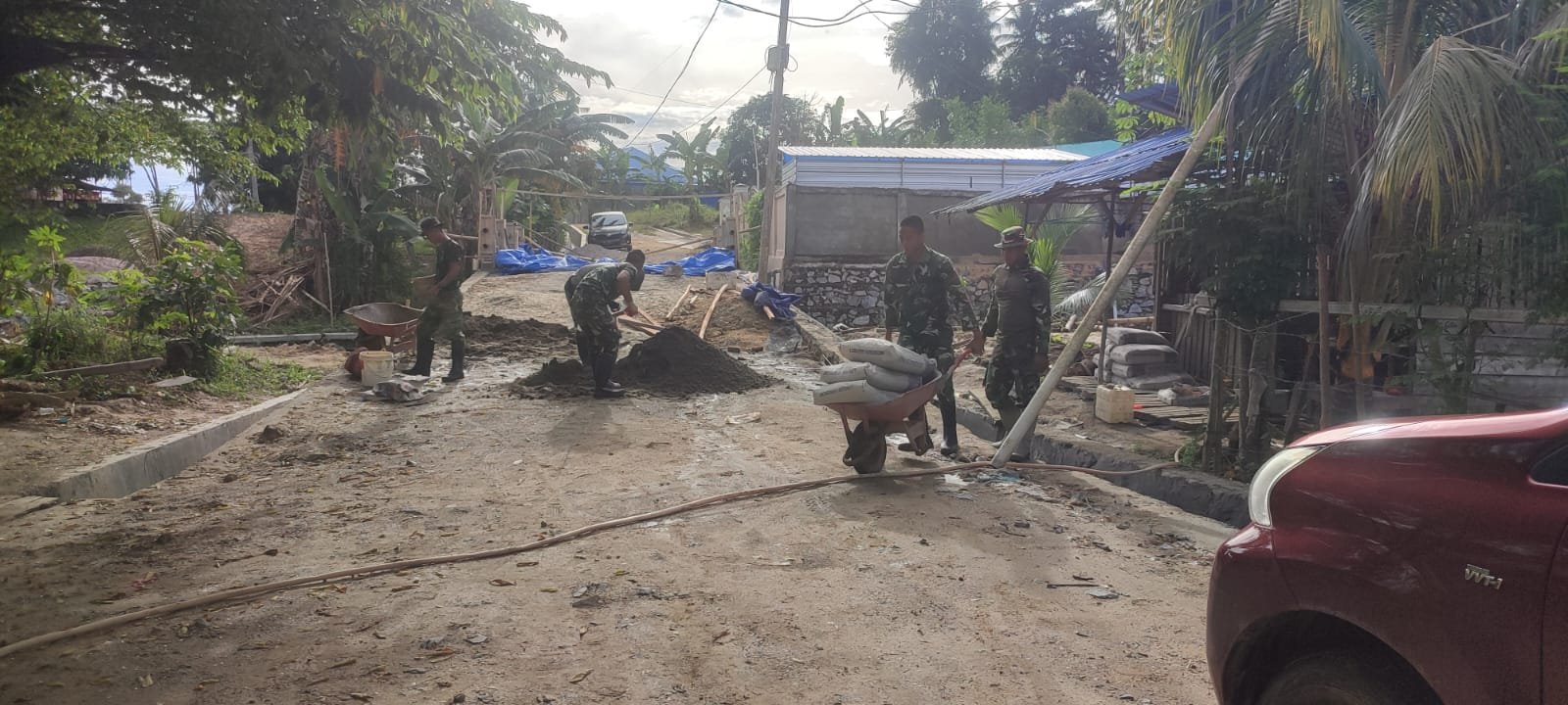 Meski medan cukup menantang, semangat gotong royong tetap menjadi energi utama di lapangan. Distribusi material yang dilakukan bertahap menjadi bagian penting dalam menjaga kelancaran pengerjaan.