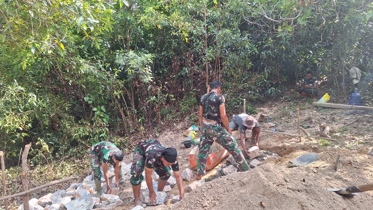 Dalam proses pengerjaan, personel Satgas TMMD terlihat bekerja bersama warga secara gotong royong. Mereka saling membantu mengangkut material seperti batu, pasir, serta semen menuju titik pembangunan yang berada di medan cukup menantang.