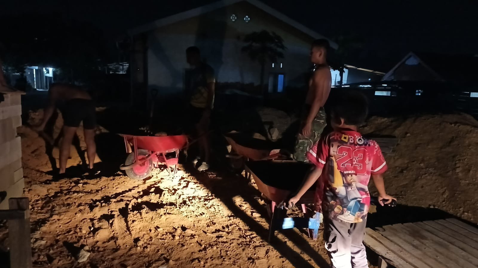 Dengan memanfaatkan sorot lampu kendaraan sebagai penerangan, personel Satgas terlihat bahu-membahu mengangkut dan menata material bangunan di lokasi pengerjaan.