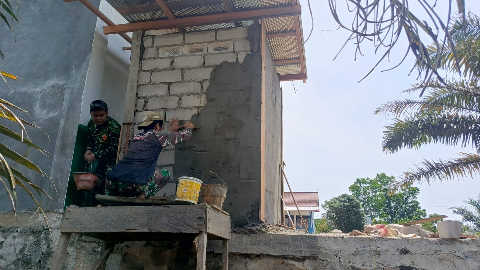 Tahapan yang kini dikerjakan adalah proses pemelesteran dinding menggunakan campuran semen dan pasir. Para prajurit TNI bersama warga setempat terlihat teliti meratakan adukan pada permukaan batako agar struktur bangunan menjadi lebih kokoh dan rata.