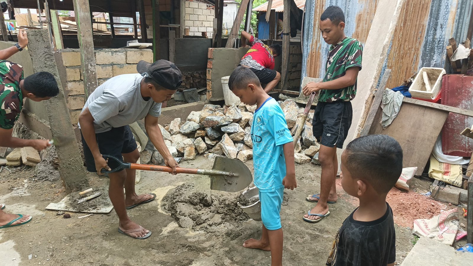 Di sela aktivitas pembangunan Rumah Tidak Layak Huni (RTLH), sejumlah anak tampak membantu melangsir material adukan semen dalam skala ringan. Kehadiran mereka menjadi pemandangan yang menghangatkan suasana lokasi pekerjaan.