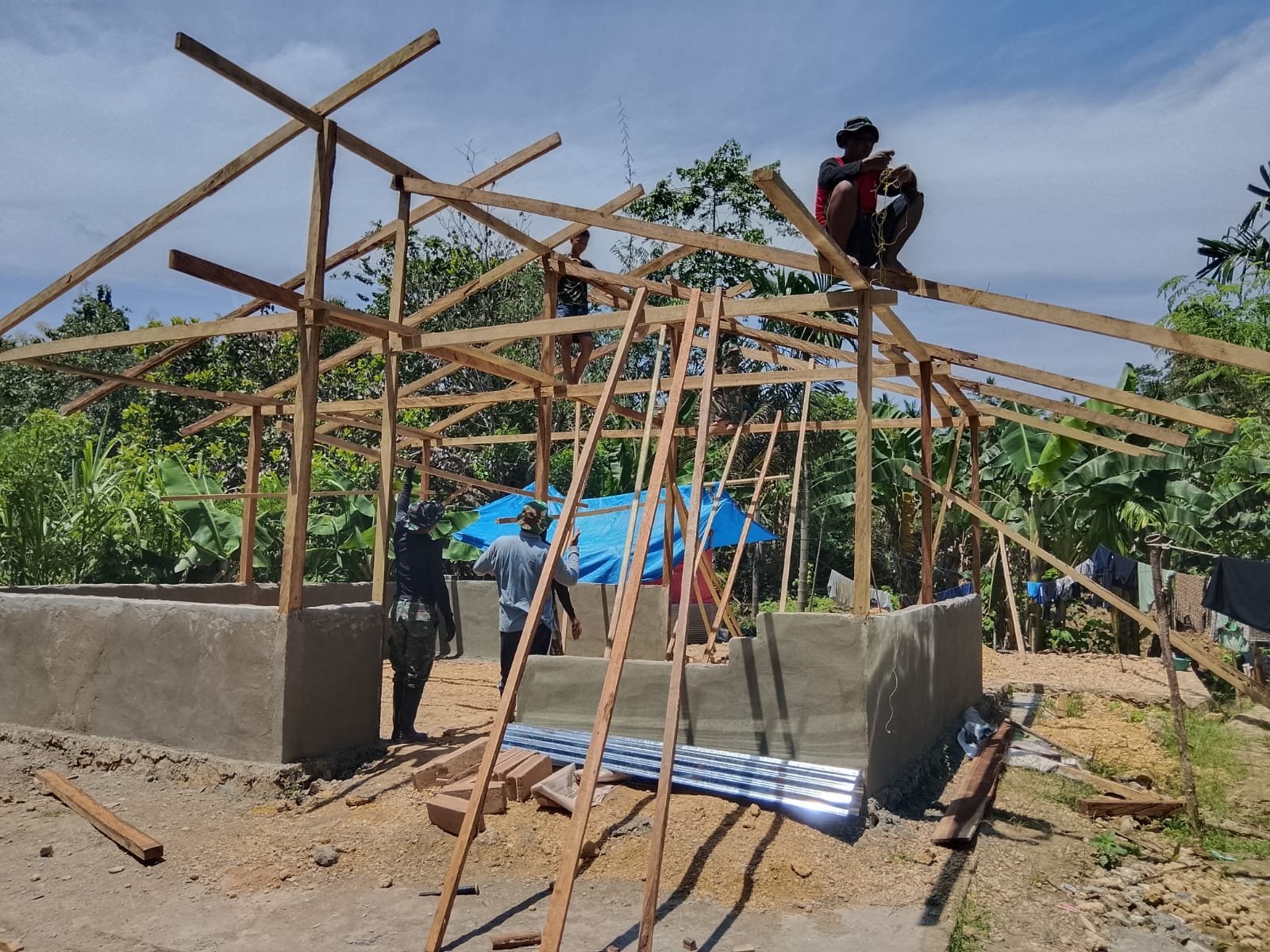 Para prajurit bahu-membahu melaksanakan berbagai tahapan pekerjaan, mulai dari pemasangan rangka kayu bagian atas hingga proses perapian atau pemeluran lantai bangunan.