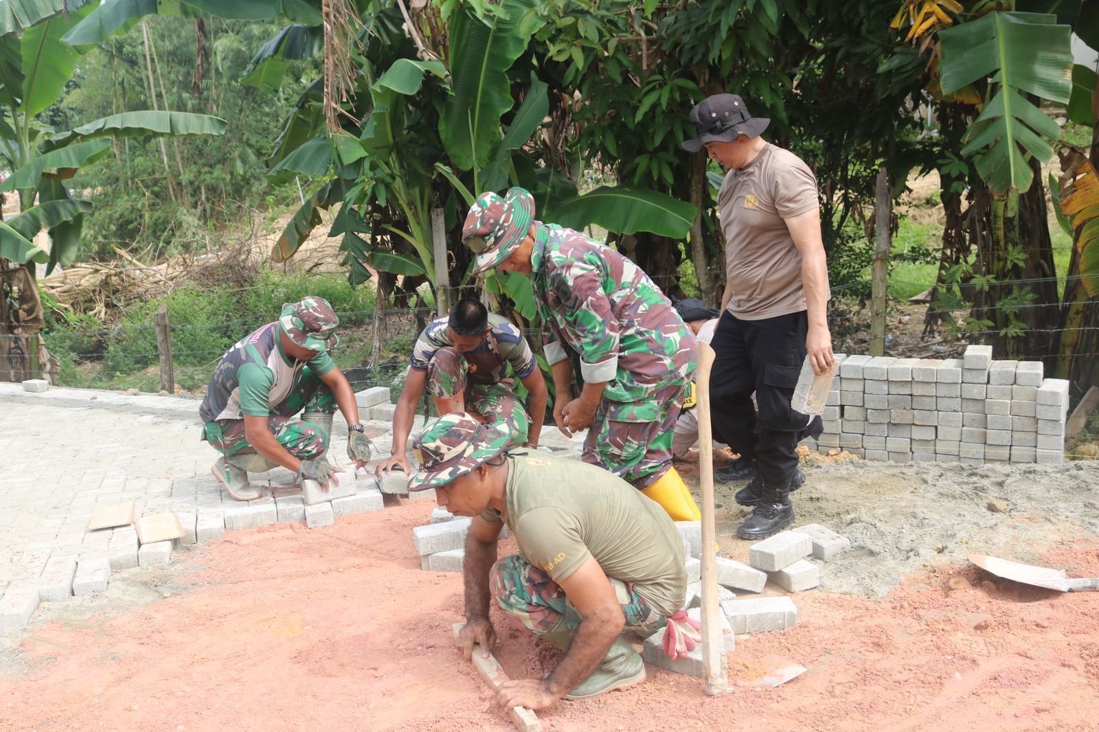 Kebersamaan tersebut tampak saat personel kedua institusi bahu-membahu memasang paving blok demi menciptakan akses jalan yang lebih layak bagi masyarakat.